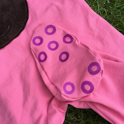 Die grosse Fläche auf dem Bauch hat mich dazu verleitet einen Kuschelbären darauf zu applizieren. Er ist aus hochflorigem Nickiplüsch und seine Ohren stehen frei. Töchterchen muss nämlich immer etwas streicheln, wenn sie in der Nacht erwacht und wieder zurück in den Schlaf finden will. Früher haben dazu meine Achseln gedient oder ihre Hose aus kuscheligem Nicki, jetzt hat sie den Bären. Und morgens, wenn sie verschlafen und mit Schnuller im Mund vor mir steht und mit ihren Fingerchen die Ohren vom Bären knetet, sieht sie einfach nur süss aus!